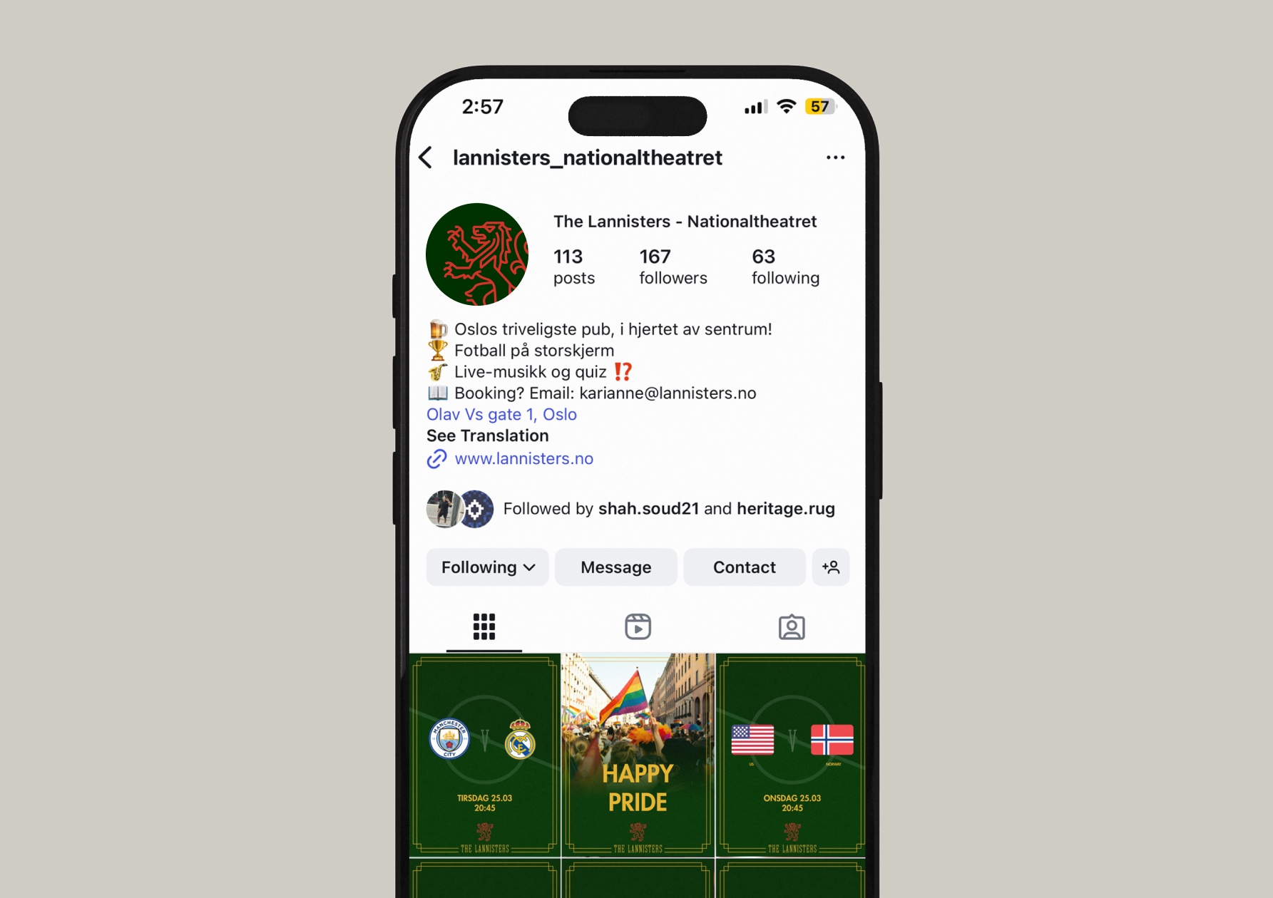 For The Lannisters, a contemporary Irish pub in Oslo, I developed a complete visual identity system rooted in heritage, clarity, and modern pub culture. The project included logo design, color system, typography, menu design, social media visuals, and a comprehensive visual guideline to ensure consistency across all touchpoints.